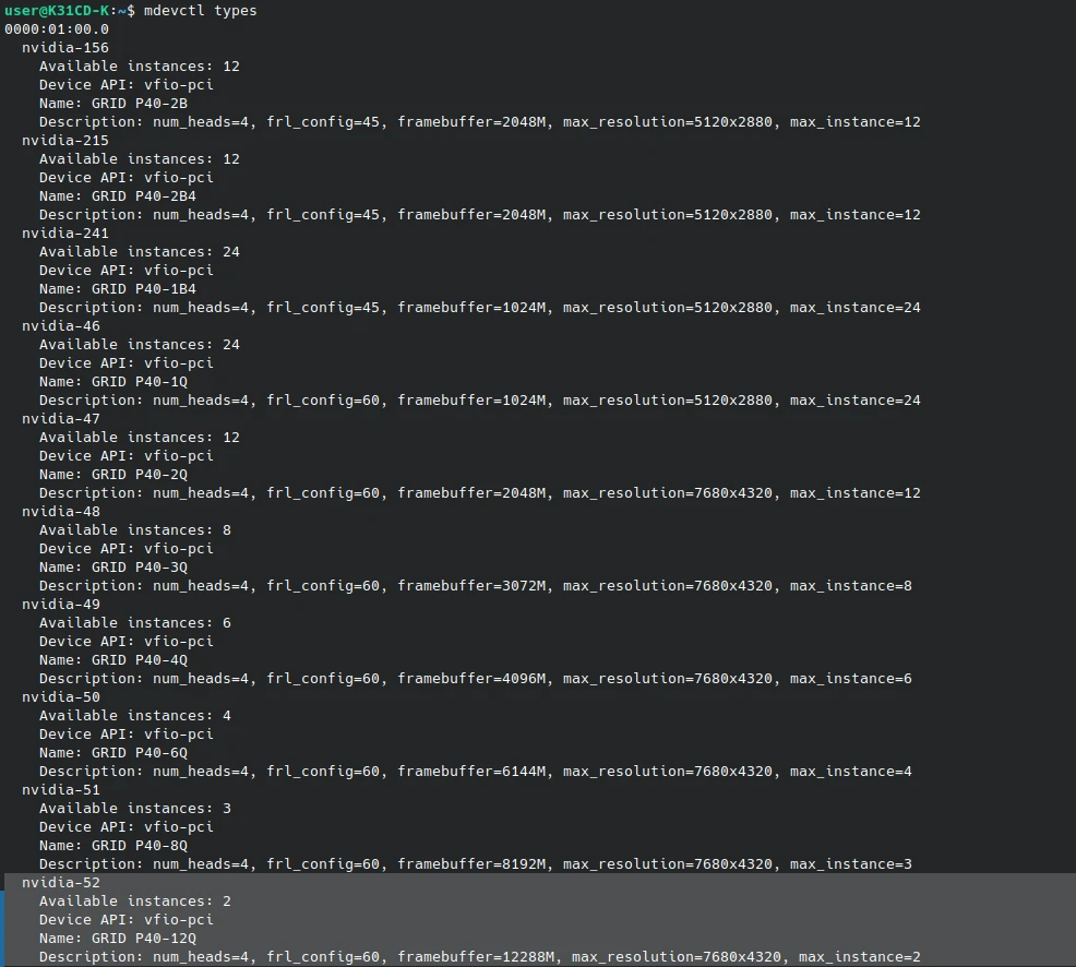 sudo mdevctl define --parent 0000:01:00.0 --type nvidia-52 --auto