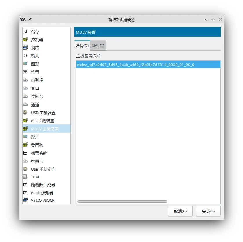 開啟Virt Manager,點選編輯虛擬機硬體,新增mdev裝置