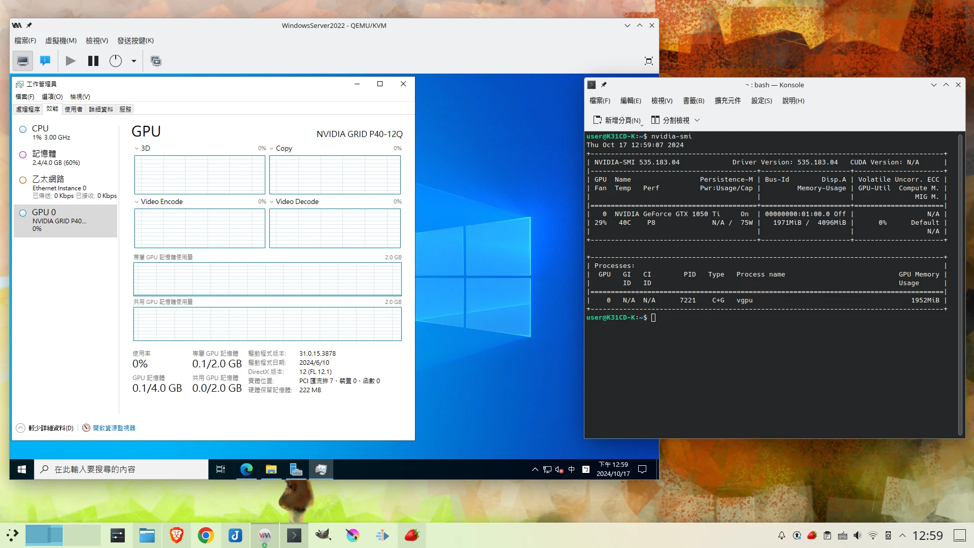 註:我取得的GRID驅動版本跟宿主機的vGPU驅動不太一樣,但還是可以裝。我在Windows 11安裝驅動會出現Error 43錯誤,可能是驅動不適合?或者與巢狀Hyper-V衝突?所以才用Windows Server。