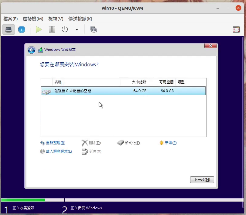開始安裝Windows,一直下一步。若要讓滑鼠脫離虛擬機視窗,請按Ctrl + Alt + G。