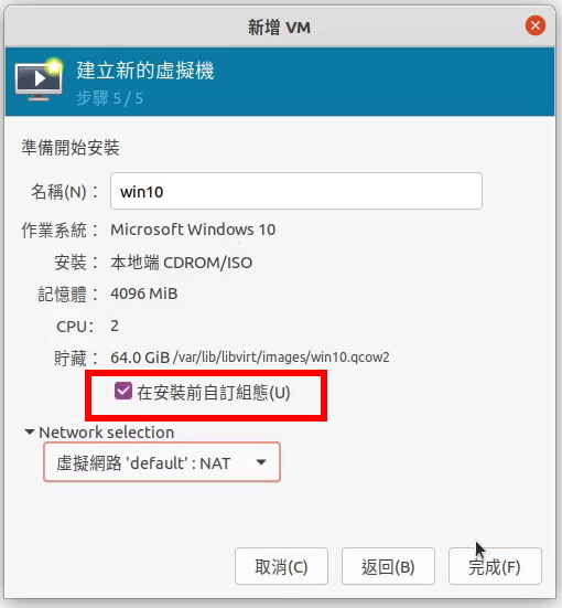 新增NAT網路卡,再勾選「在安裝前自訂組態」