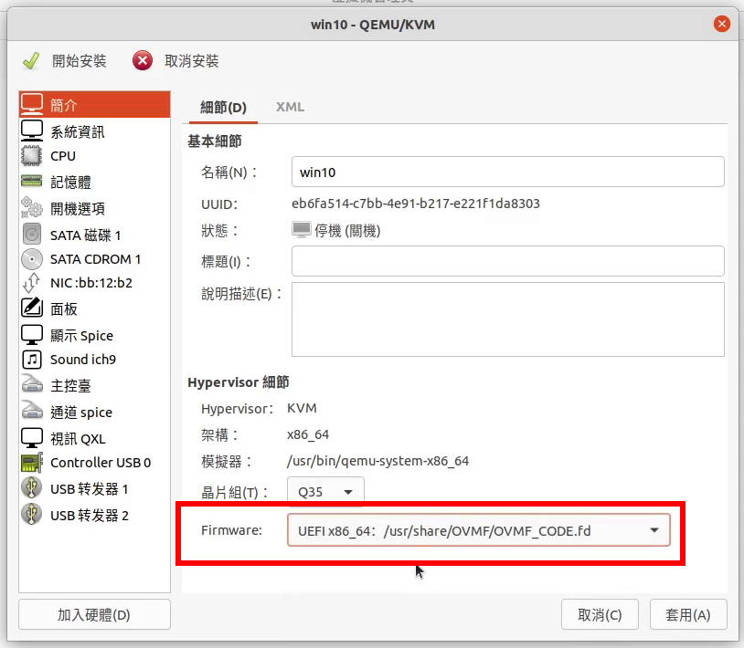 點選簡介,機器選Q35。如果是Windows 10,Firmware選「OVMF_CODE.secboot.fd」。