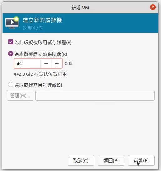 建立至少64GB的虛擬硬碟 (qcow2不會直接建立一個64GB的檔案,而是慢慢吃滿)
