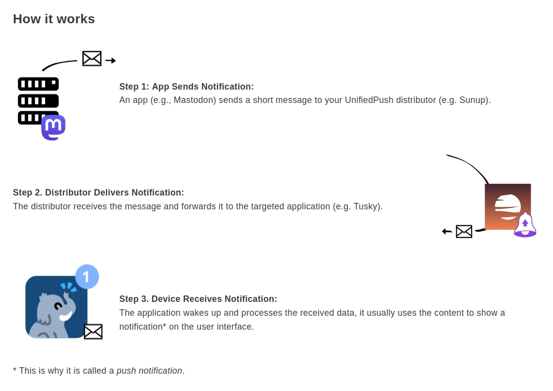 UnifiedPush便是嘗試解決依賴FCM的問題。建立一個不依賴Google,去中心化的通知推送系統。