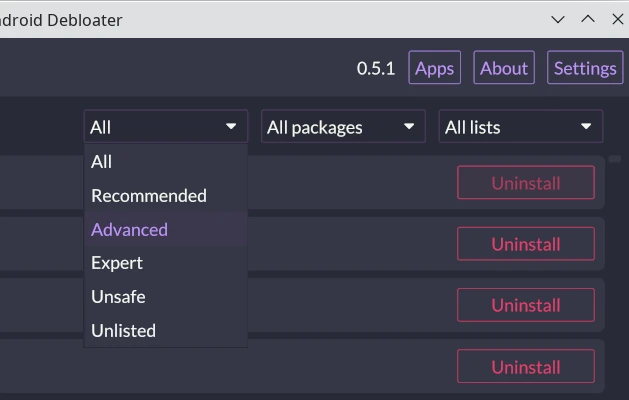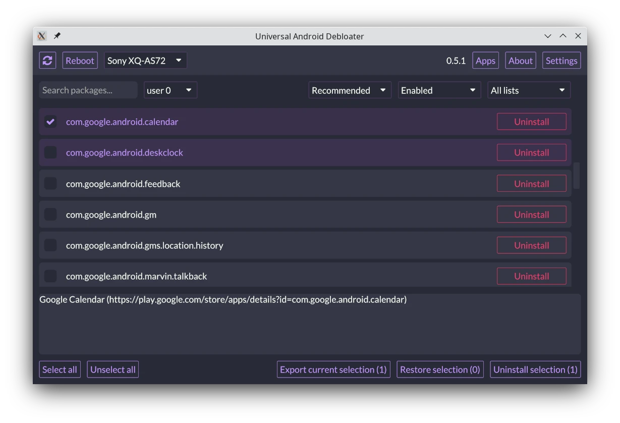 如果執意要「解除安裝」,除了Root外,你還可以嘗試「Universal Android Debloater GUI」,簡稱UAD。這款開源工具的字面意思是「將Android手機瘦身」,本體使用Rust寫成,將ADB指令封裝成圖形界面,只要點一下就能輕鬆移除不給停用的內建的APP。