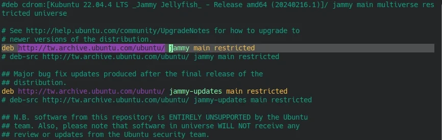 /etc/apt/sources.list,把所有jammy字串取代成noble,也就是24.04的代號。