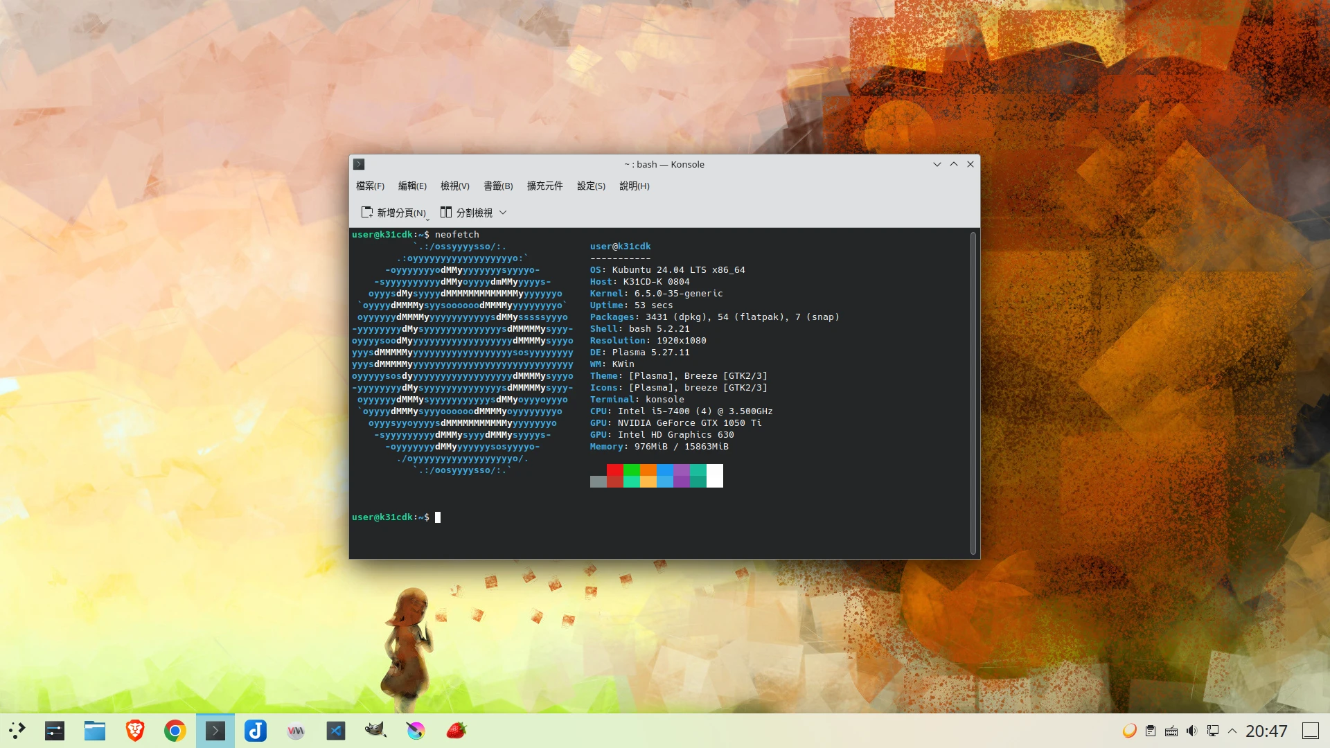 KDE功能更新部分我沒辦法多做介紹。因為使用過Arch Linux所得到的未來視,我對KDE 5.27的變化並不驚艷。按照網路資訊來看,Kubuntu 24.04改良最多的是系統安裝器Calamares的介面吧?