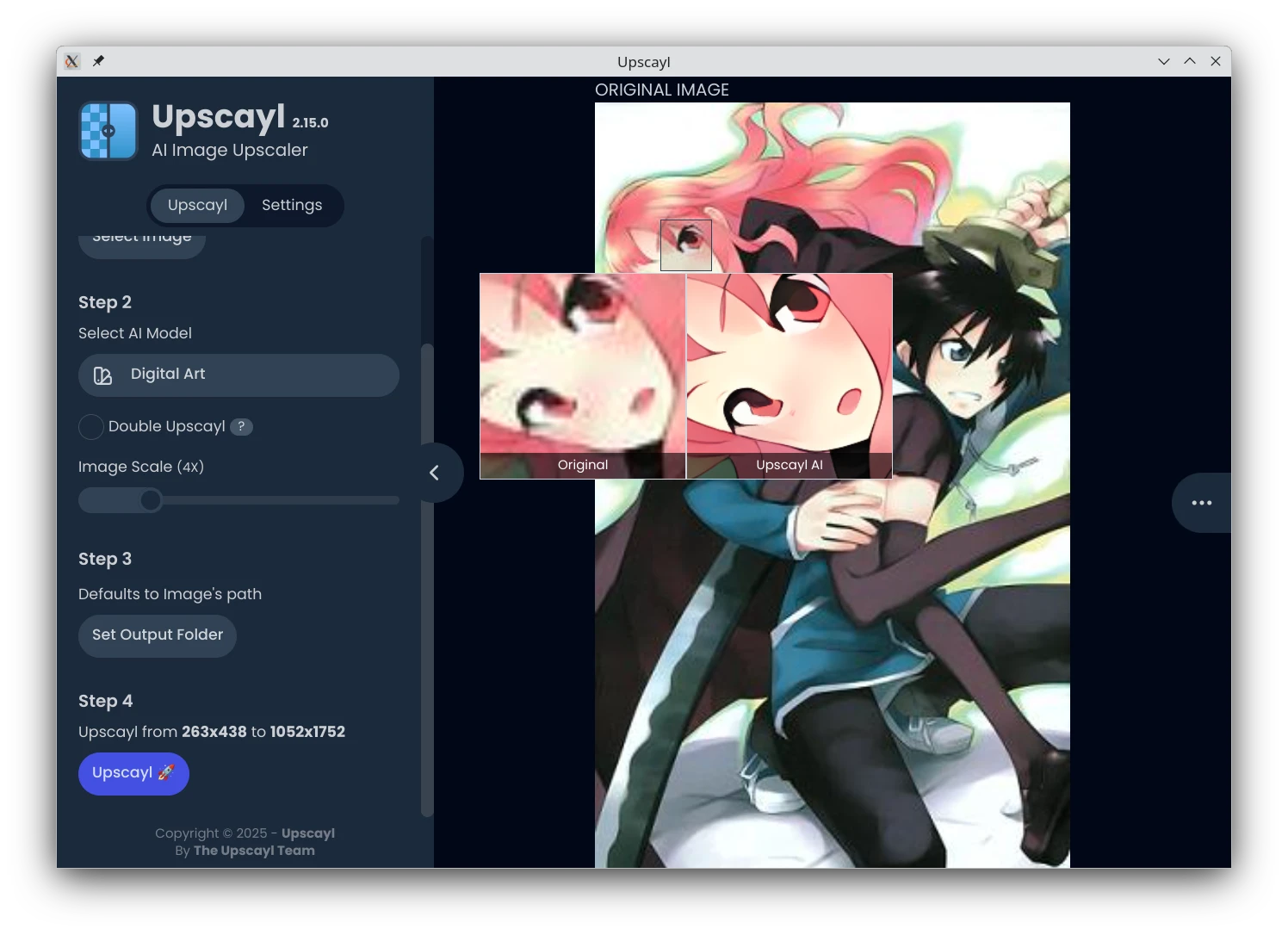 不論是真實照片還是動漫圖像,Upscayl都能夠放大,操作過程十分簡單,只要選取圖片再按放大就行了。