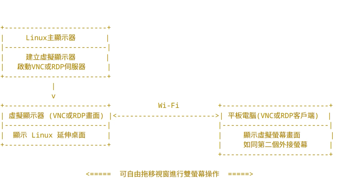 Ivon試圖在此探討另一條路線,也就是善用生成「虛擬顯示器」的功能來達成平板作為第二螢幕的操作。原理示意圖如下: