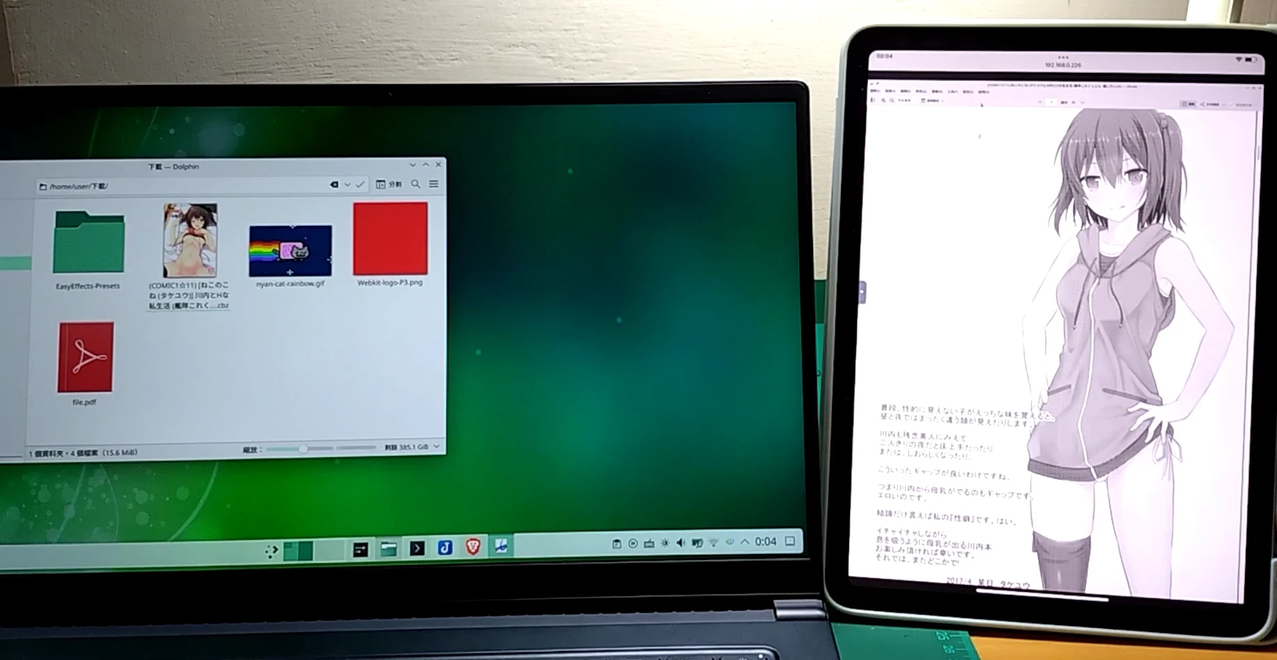 例圖,透過VNC將iPad當作KDE Plasma桌面的第二螢幕,利用直立螢幕看漫畫。
