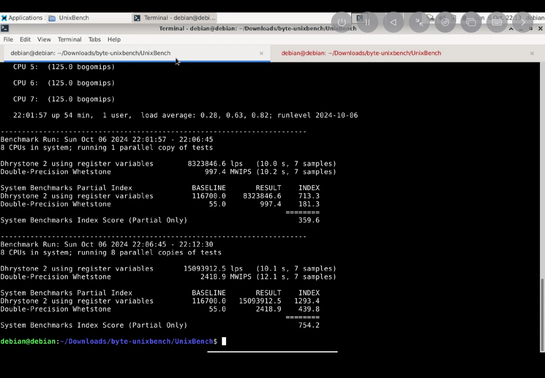 Unixbench 5.1.3分數測試CPU性能,使用指令sudo NUMBER_OF_PROCESSORS=8 ./Run whets dhry測試,分數越高越好: