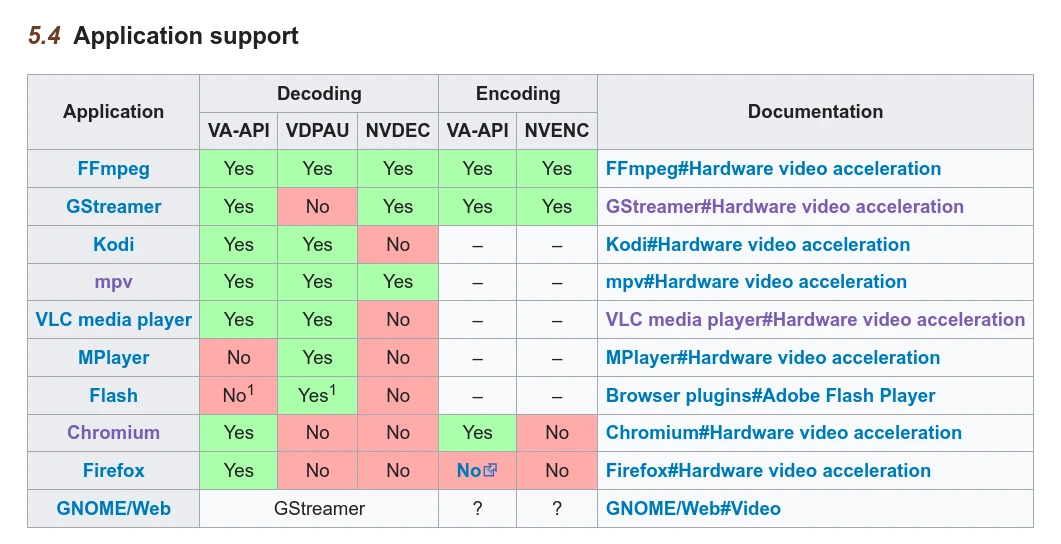 從Arch Wiki提供的這張表格來看,目前Linux系統同時支援VA-API、VDPAU、NVDNC技術的應用程式只有MPV、ffmpeg、GStreamer。