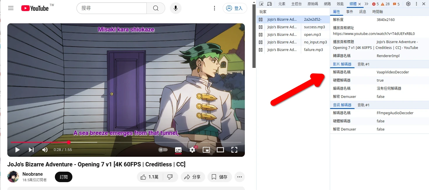 啟動之後可以按F12開啟開發人員工具,點選更多工具 → 媒體頁面,確認影片解碼器是否為VA-API。