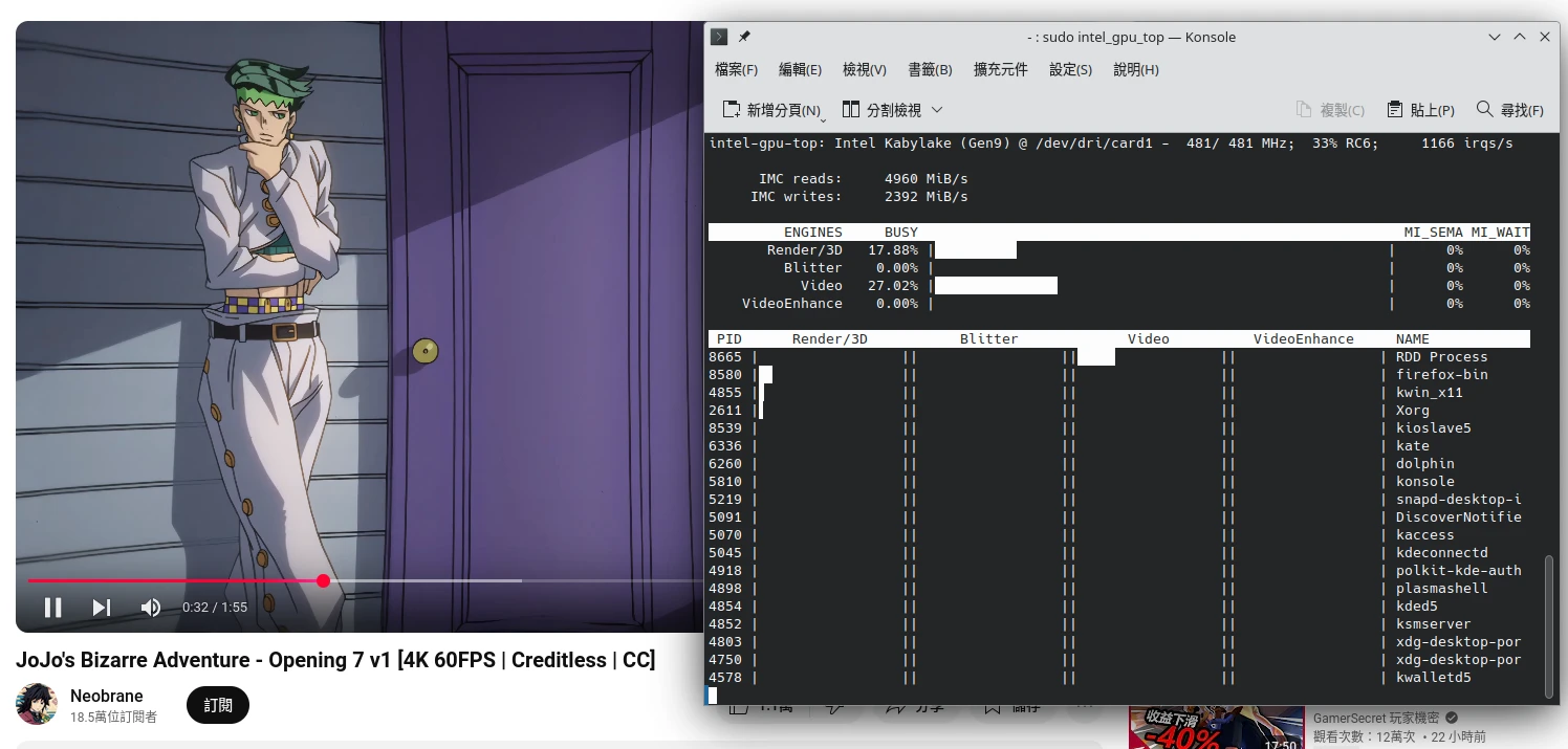 sudo intel_gpu_top指令,放在一邊,等會觀察播放影片的時候,Video使用率是否有上升。順便執行htop,比較CPU佔用情況。Firefox (v.135) 開箱即用,無需做任何變更。