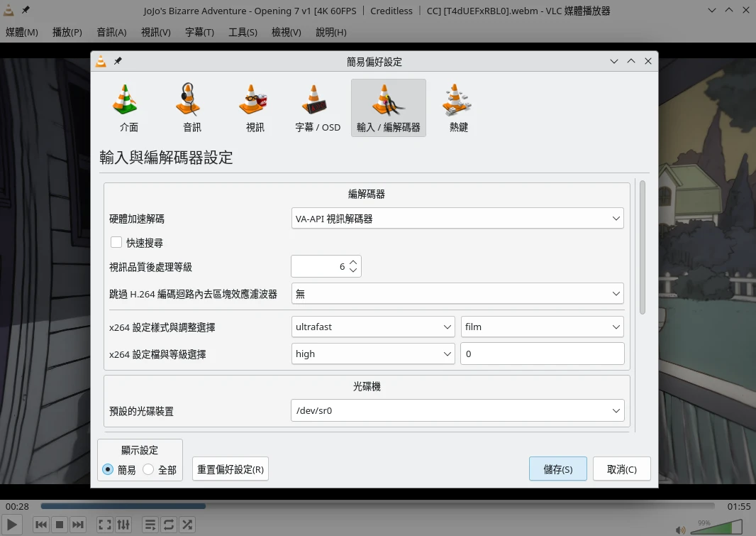~/.config/mpv/mpv.conf,加入以下內容,才可以使用VA-API加速。