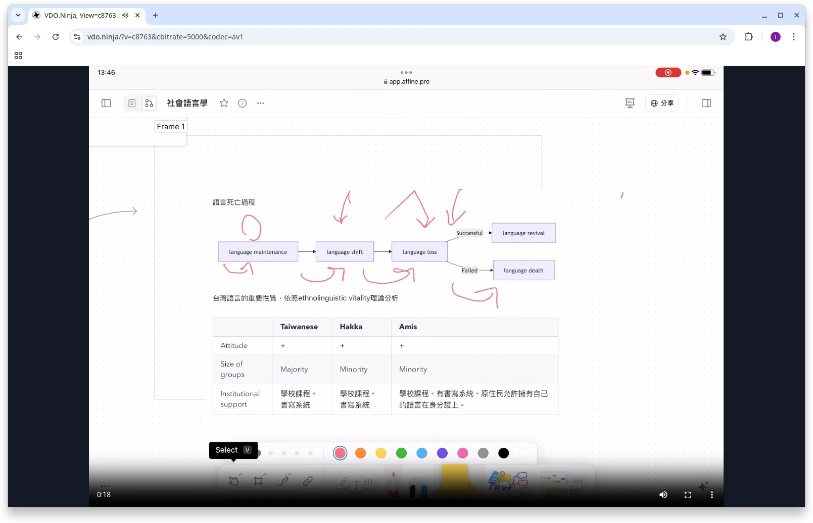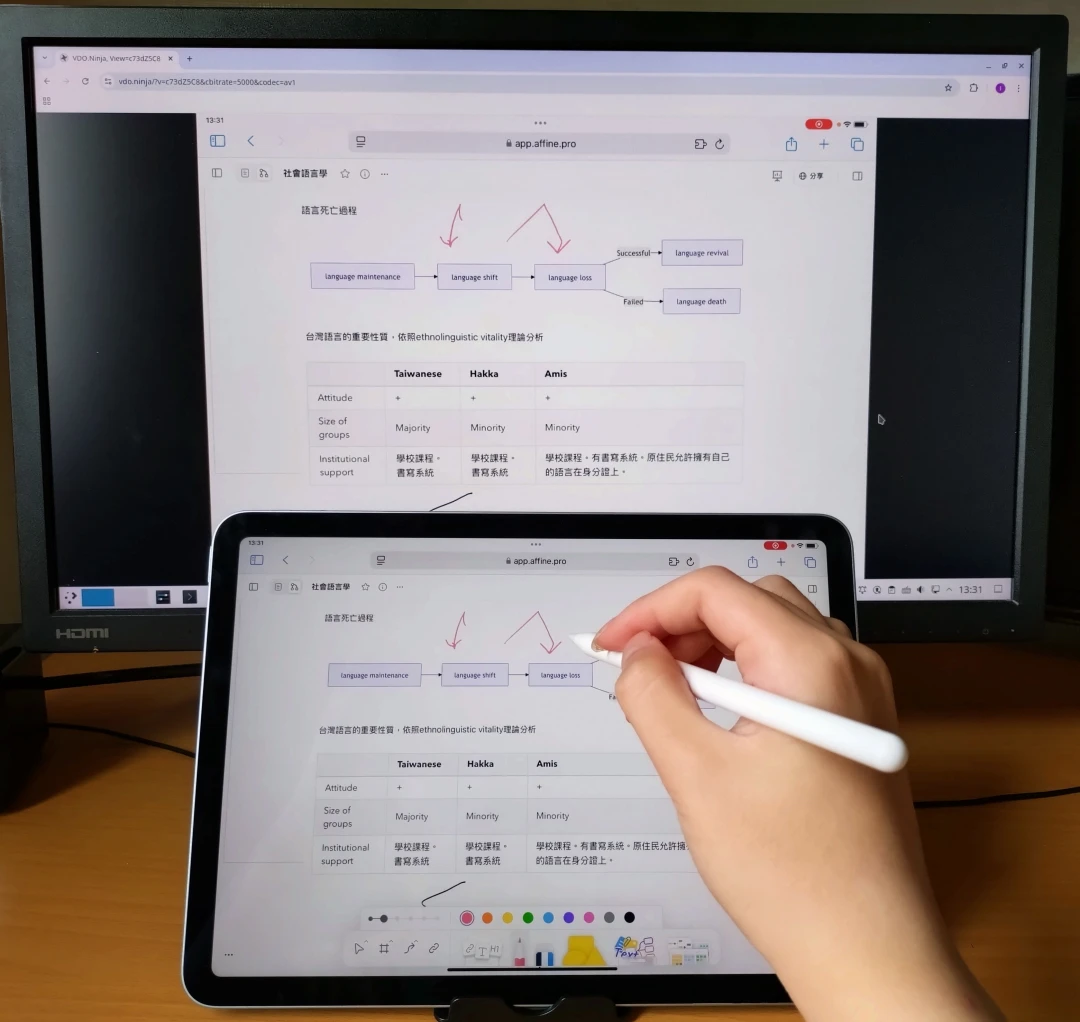 譬如,在iPad上開啟AFFiNE筆記軟體,展示簡報內容,並用Apple Pencil圈選。聽眾就能透過瀏覽器即時看到我iPad的畫面動作,整個過程就像看直播一樣。