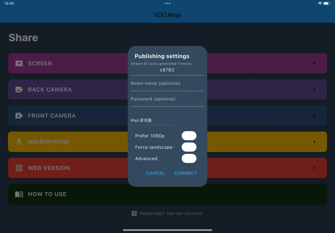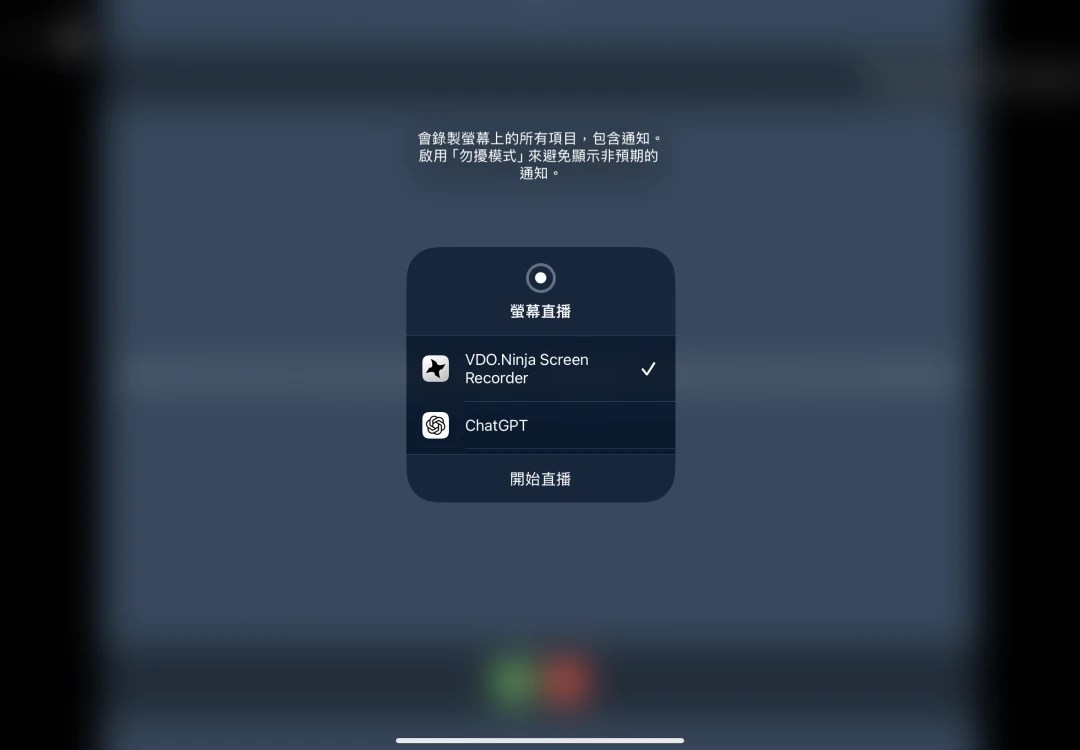 開啟VDO Ninja APP,點選Screen,這裡Stream ID可以自訂一組英數組合,不然就隨機生成。Password設定房間密碼。至於要不要允許錄音,我個人體感開著錄音(選取iPad麥克風)但不要放出聲音,比較不會被iOS殺後台。