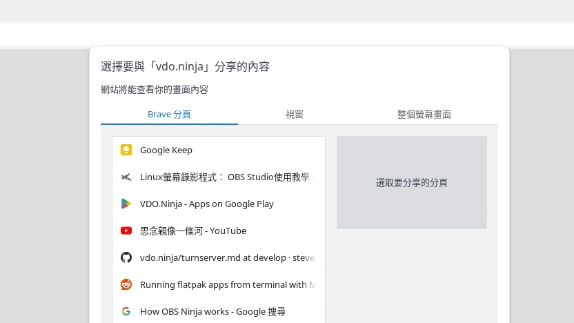 電腦進入VDO Ninja網頁,點選Share your screen,接著選取視窗即可。