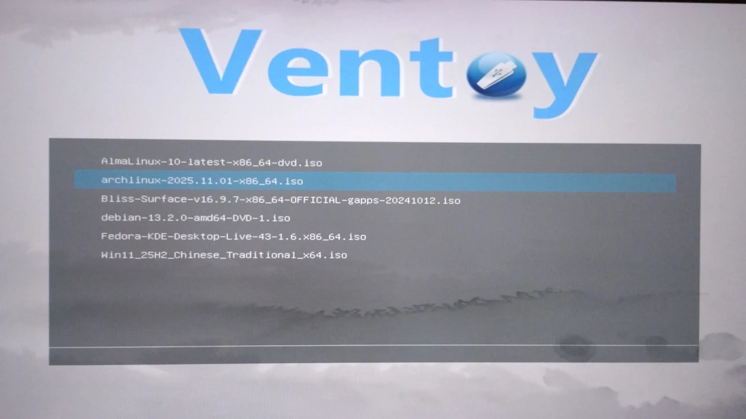 電腦重開機,按Delete進入UEFI,將開機順序設為USB優先。接著開機就會看到Ventoy的畫面。列表上顯示的是隨身碟裡有的ISO,用鍵盤選擇開機。