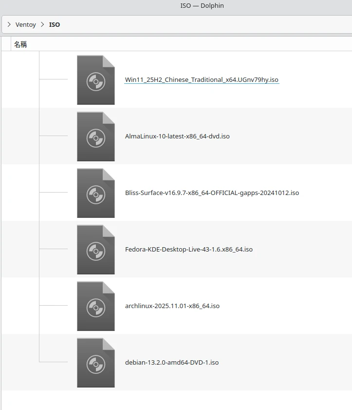 VTOYEFI分區是Ventoy的開機引導,這部份不要動。可自由使用的是另一塊較大的空間Ventoy,這裡就是能自由儲存資料的分區。系統ISO直接放這裡就行了,例如我放了Windows和Linux的ISO,Ventoy開機會自動偵測。即使放在資料夾裡面也讀得到。