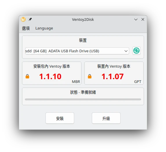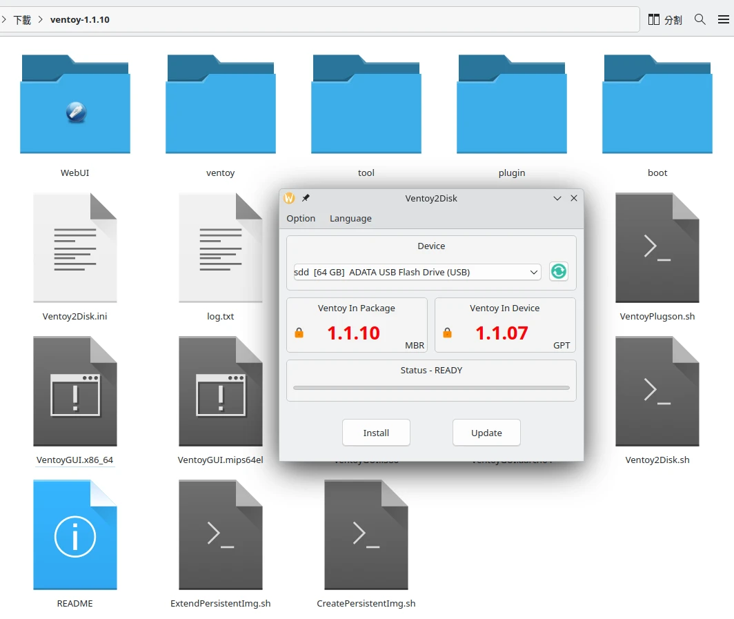 Linux電腦,在Ventoy的目錄對VentoyGUI.x86_64點兩下,開啟圖形界面。