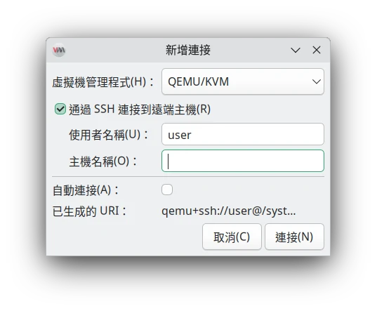 開啟Virt Manager,點選新增連線