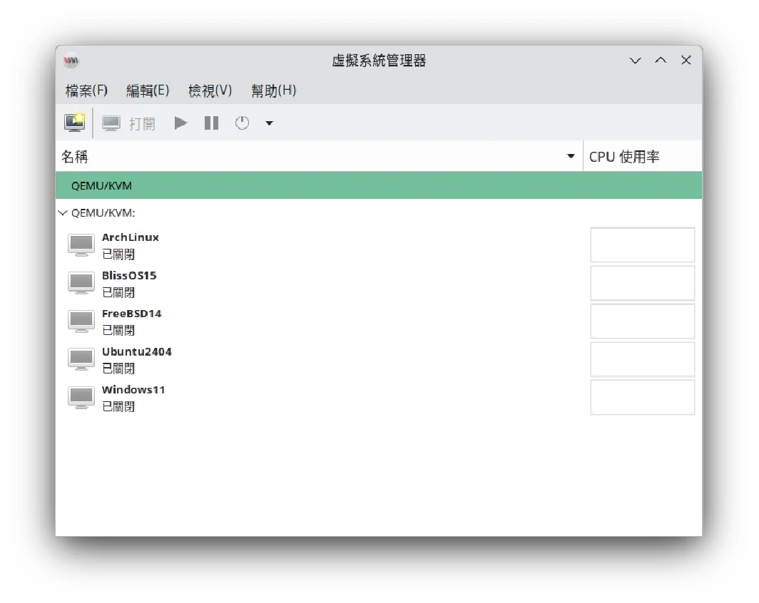 如果本機端是Linux,那就用Virt Manager (Virtual Machine Manager,虛擬機器管理器),很多Linux發行版都有收,比如Ubuntu: