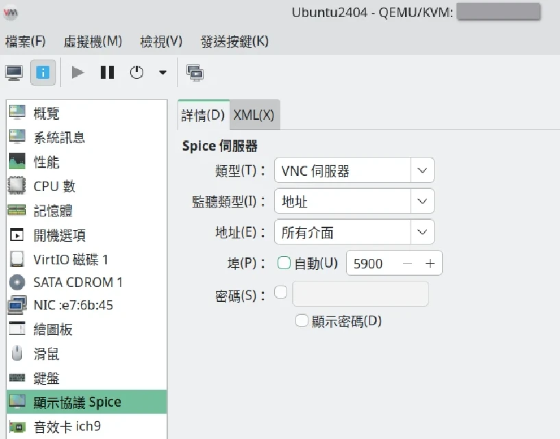 Virt Manager預設是用SPICE顯示遠端虛擬機的畫面,但延遲高,不適合遠端使用,改用VNC在低網速下表現較好。