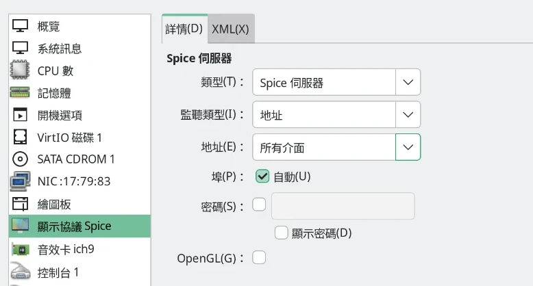 Virt Manager預設使用SPICE,如果要在本機端看到遠端畫面,需要編輯虛擬機硬體的SPICE設定,設定為監聽所有界面。