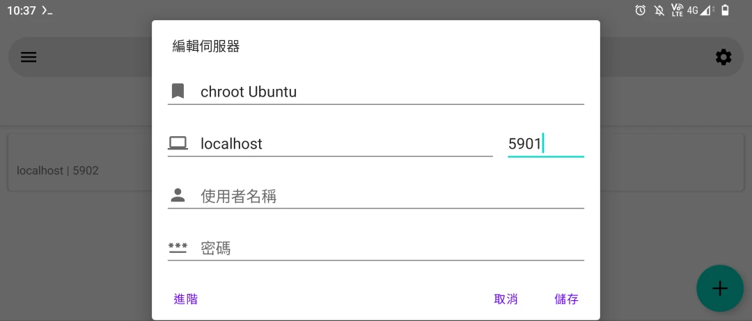 欲行本機連線:手機開啟AVNC APP,新增主機連線,地址填localhost,通訊埠填5901