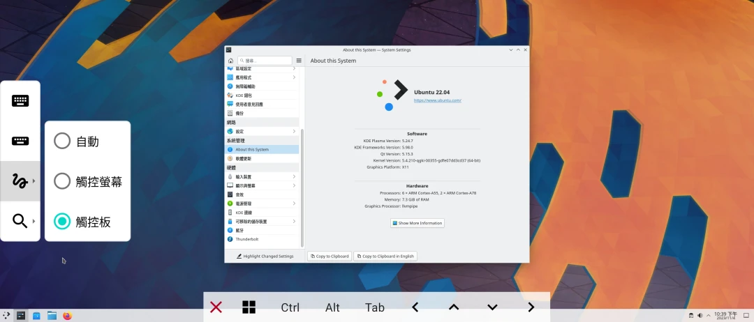 AVNC操作建議點左邊按鈕改成觸控板模式。如果嫌Linux桌面字體太小,請降低解析度,或者到該桌面環境的設定調DPI。