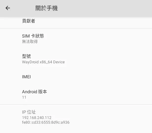 開啟Waydroid系統設定,到「關於手機」查找IP位址,通常是192.168開頭