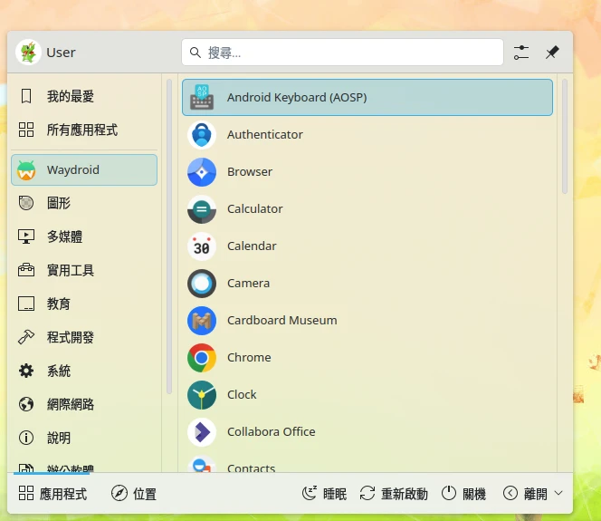安裝好Waydroid之後,你應該會在Linux桌面的應用程式列表看到Waydroid與各個Android APP的圖示。GNOME會跟一般Linux應用程式混在一起,KDE Plasma則是會專門顯示一個Waydroid的資料夾。