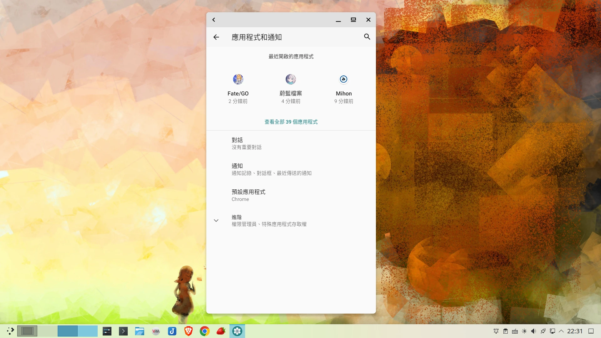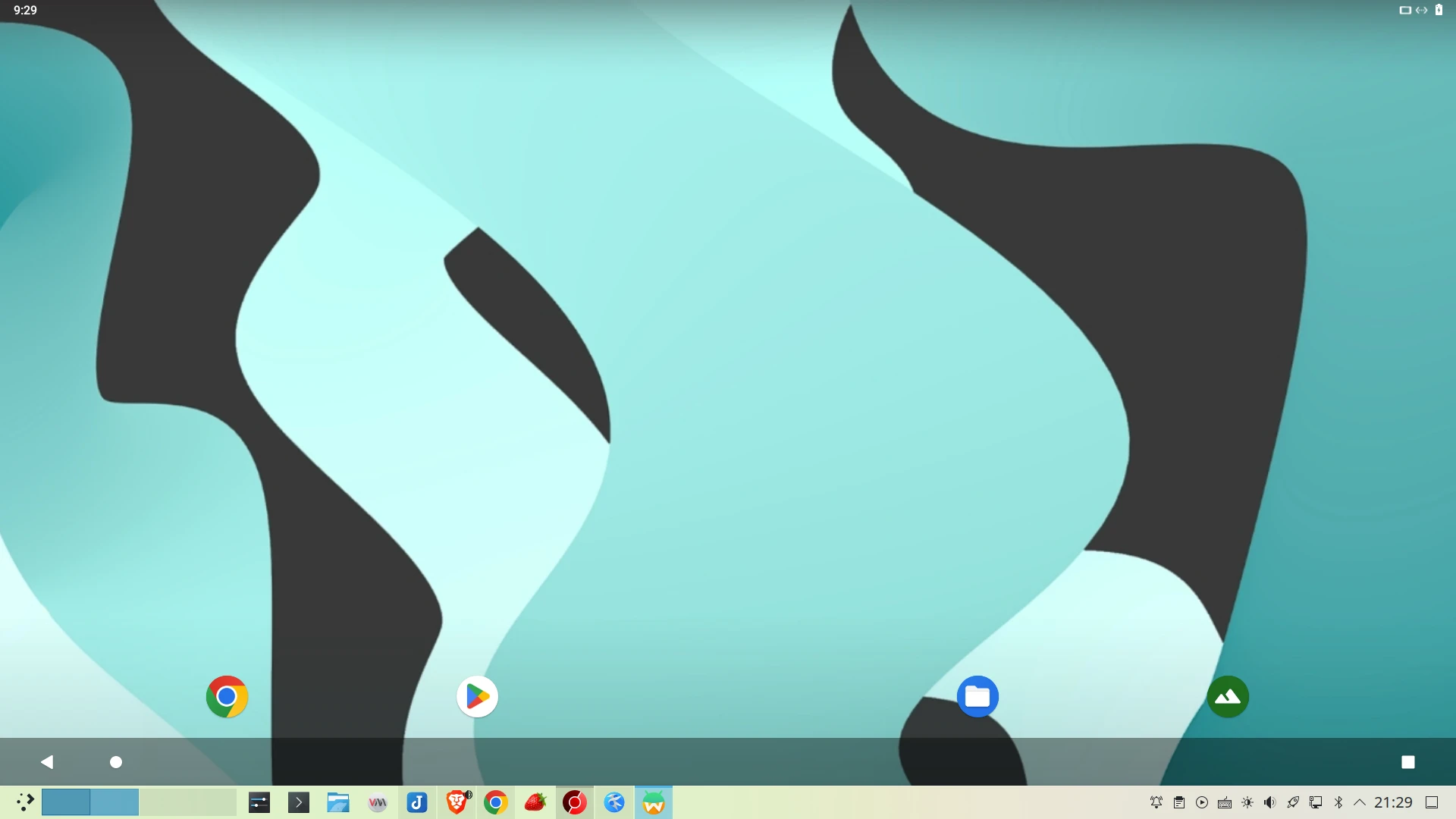 如果點選「Waydroid」圖示,效果等同執行waydroid show-full-ui指令,此時會彈出Android主畫面,能夠存取通知欄,所有的操作都限制在這視窗內。一次只能執行一個APP,就好像在使用平板一樣。