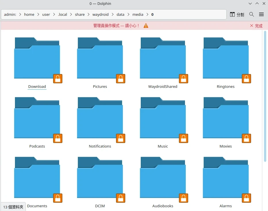 如果使用KDE Dolphin檔案管理器6.0以上版本進入,可以申請Root權限強制讀取Android的檔案。