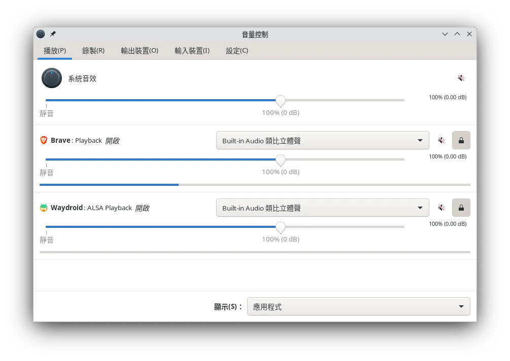 Linux桌面的音量控制面板可以單獨將Waydroid的輸出靜音,譬如pavucontrol。