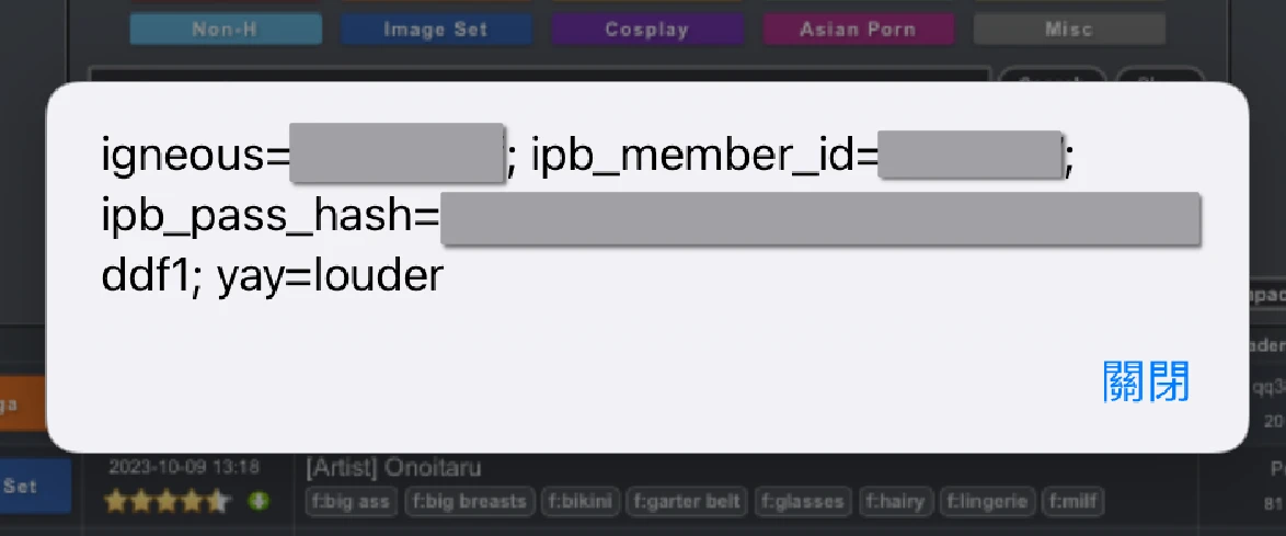 https://exhentai.org網頁,然後點一下剛剛新增的書籤,就會顯示Exhentai cookie的數值。把這三個數值記下來。