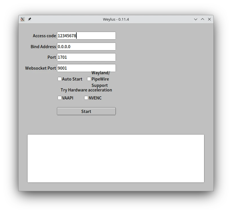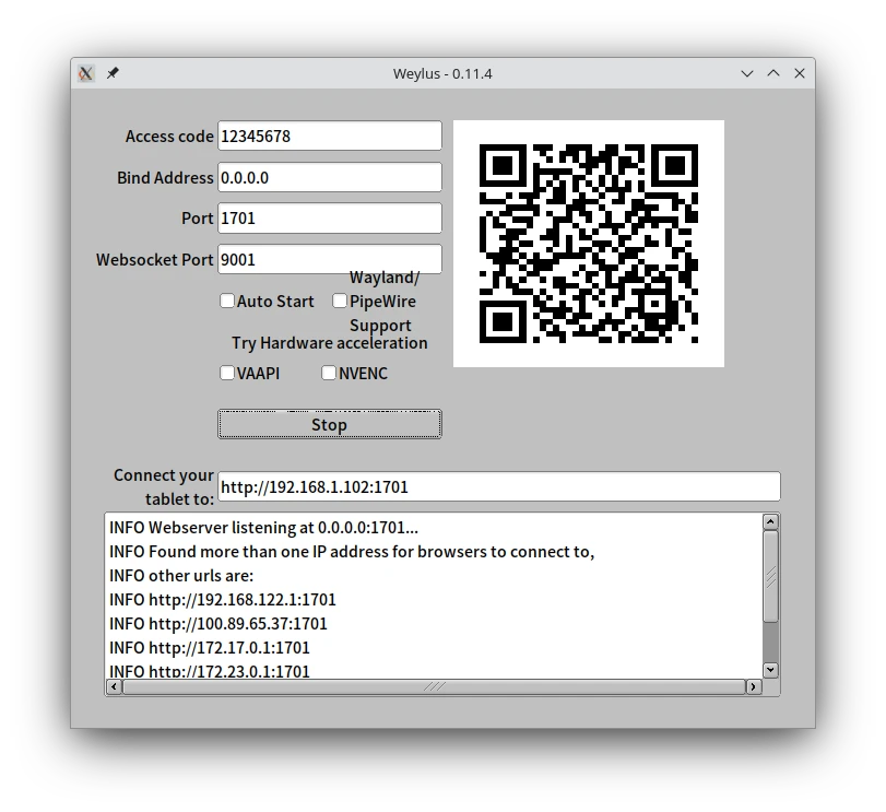 電腦開啟Weylus程式,填入自訂密碼(Access Code)。若為Wayland工作階段,需勾選PipeWire選項。點選Start。