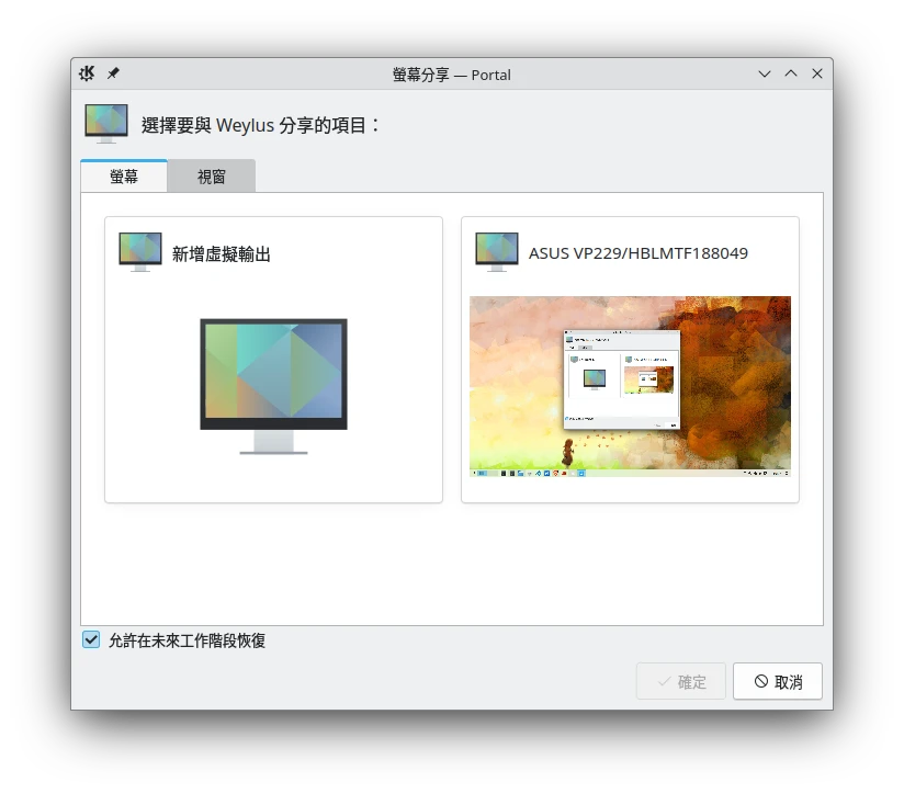 或者,在Weylus請求連線的時候,選取建立「虛擬輸出螢幕」。