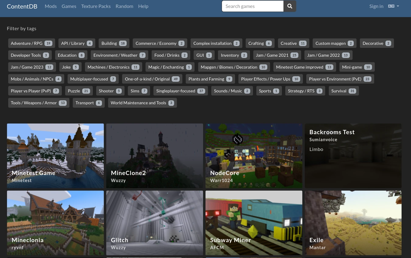 此外,ContentDB收錄了許多社群製作的子遊戲,上面有名的子遊戲除了複製Minecraft玩法的VoxeLibre外,還有自創世界觀的《NordCore》、借鑒Subway Surfer元素的《Subway Miner》、在月球生存的《Moontest》等等,都是跟原本沙盒遊戲截然不同的玩法。