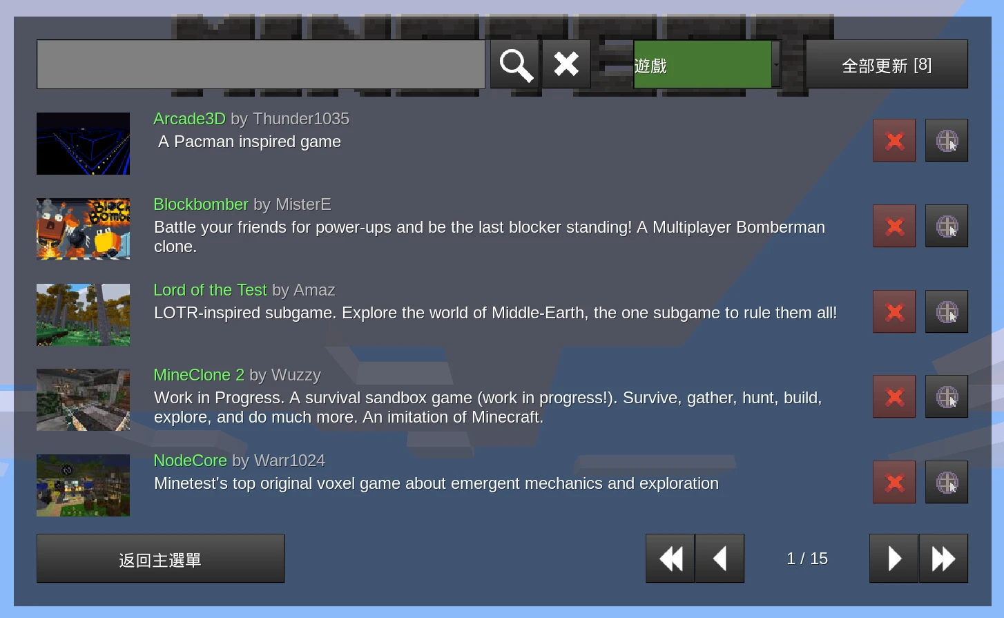 從Luanti的主頁面,點選「內容」→「瀏覽線上內容」,右上角過濾器選擇「遊戲」,下載想要的子遊戲。