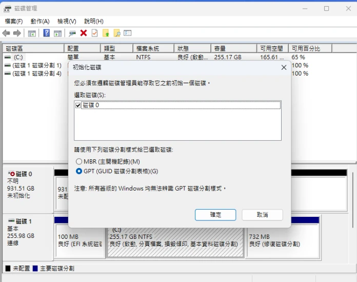 比如,Windows 11對Windows點右鍵 → 磁碟管理員,Windows偵測到BTRFS的硬碟就提示要新增磁區。此時請不要真的按下去,資料會不見的。