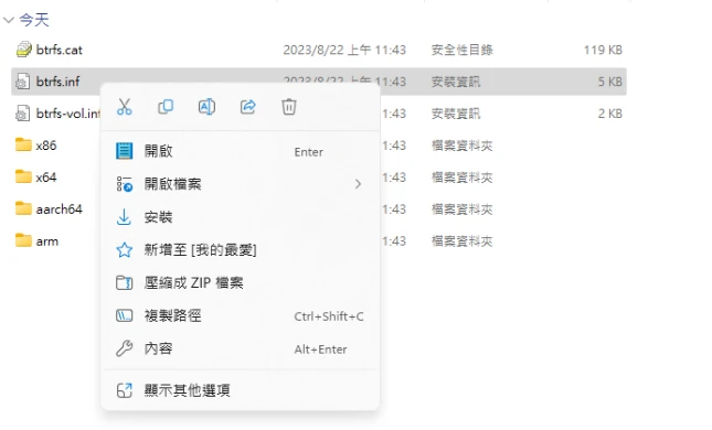 解壓縮後點選btrfs.inf檔,右鍵安裝驅動程式,爾後重新開機。