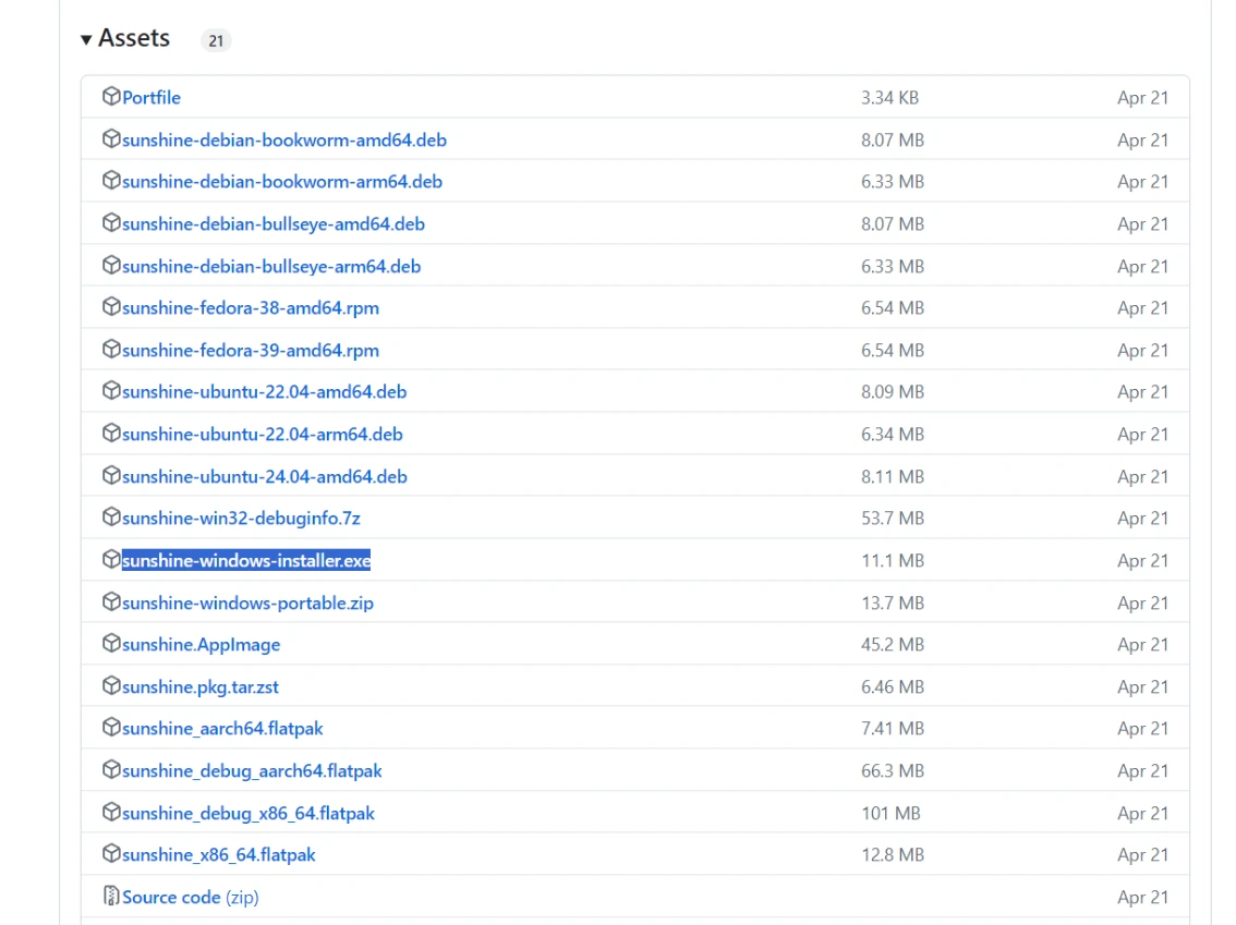 Sunshine專案現由LizardByte維護,請至Sunshine的Github Release,找到Latest標籤,點Show all assests,下載