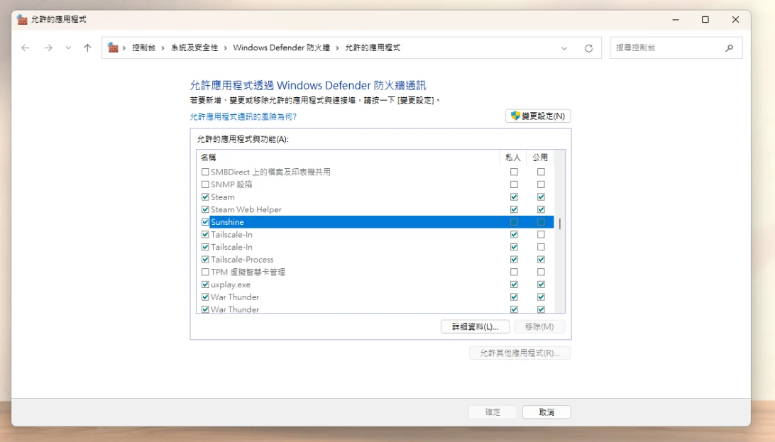 請開啟「Windows防火牆設定」,允許應用程式通過防火牆,確認Sunshine是否有打勾。