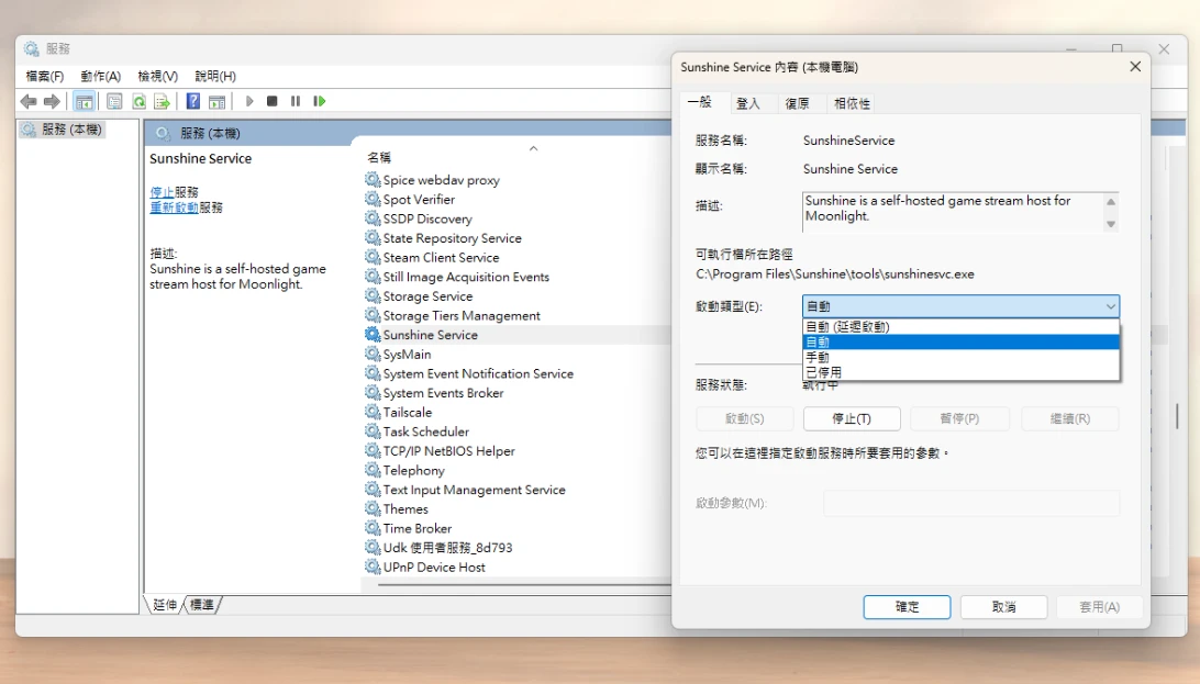 Windows的「服務」選單可用於控制Sunshine是否要在電腦開機後自動啟動。