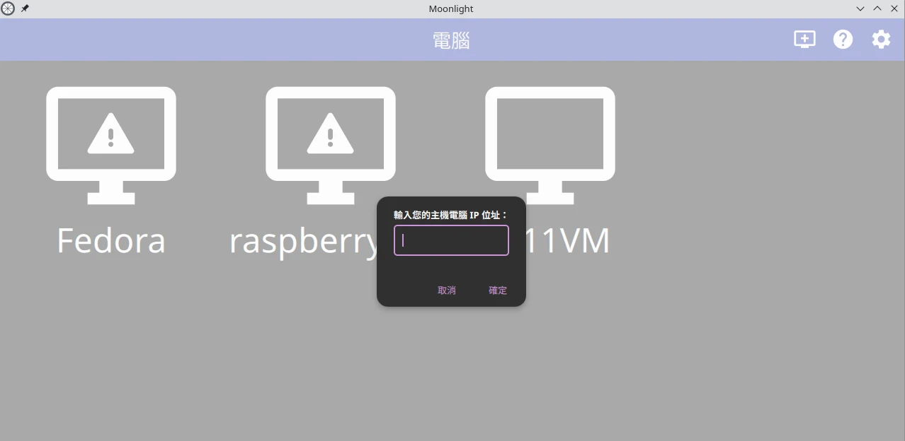 使用內網穿透軟體的時候,Moonlight會掃不到遠端的Sunshine伺服器,這個時候你要點選右上角「輸入IP」,手動輸入遠端電腦的虛擬區域IP才能連線。