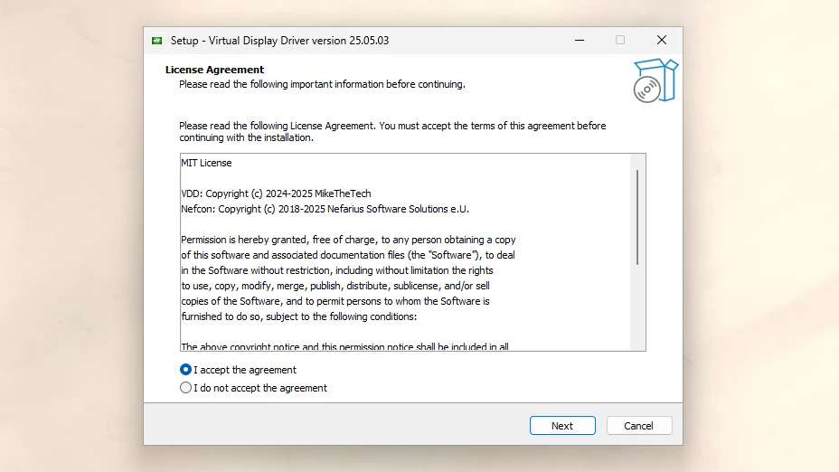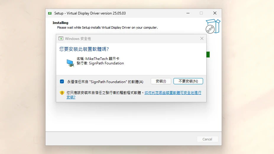 Virtual.Display.Driver-setup-x64.exe執行exe安裝,一直下一步,並依照畫面指示安裝.Net Desktop Runtime套件。這個安裝器除了安裝虛擬顯示器的驅動之外,還有一個VDD Control面板。
