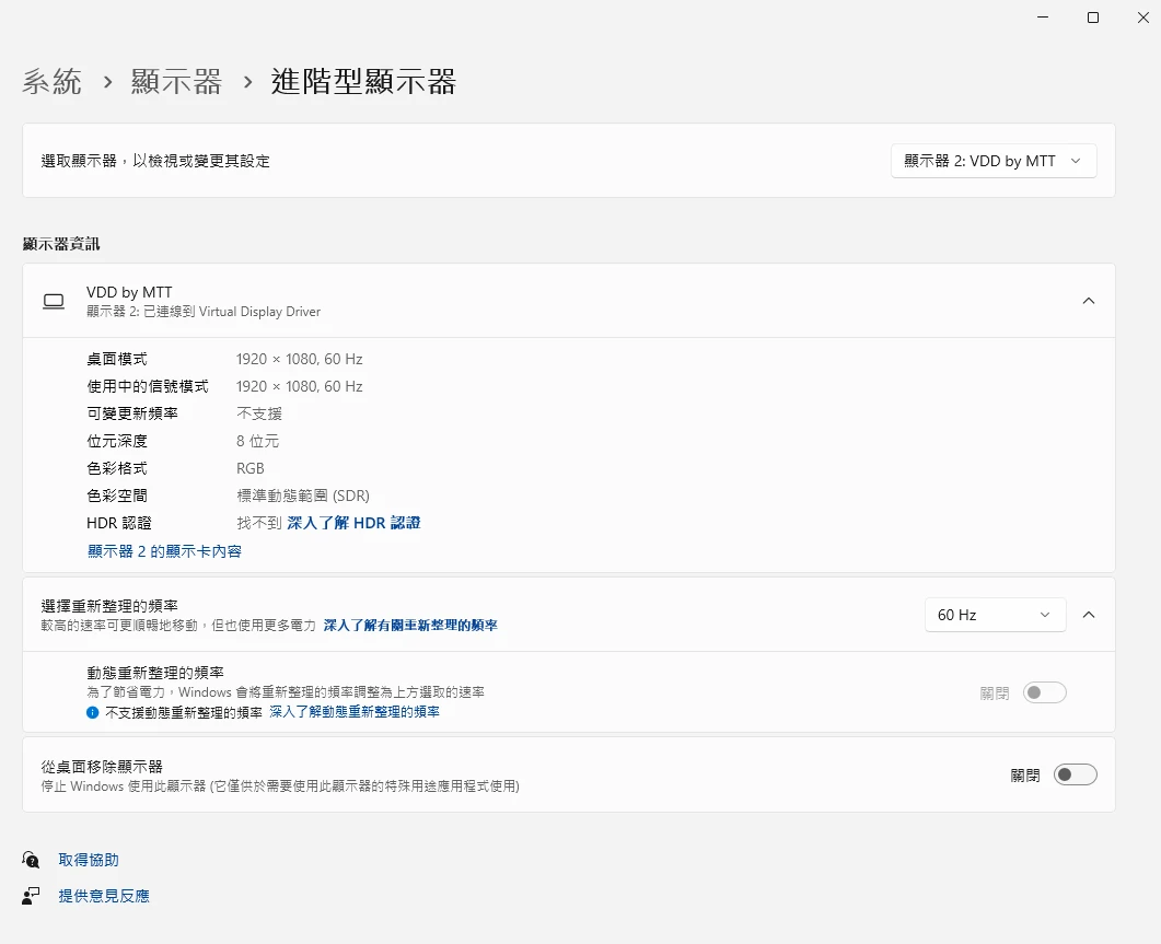 若要把這個虛擬螢幕關閉,請在進階顯示設定 → 從桌面移除顯示器,暫時關閉該螢幕。
