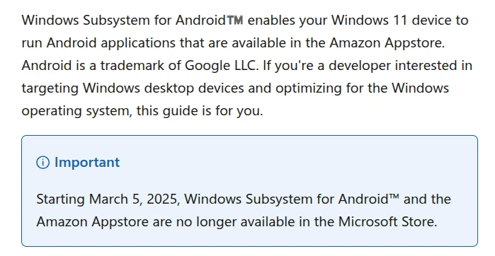 不幸的是,2025年Microsoft宣佈放棄支援WSA,這個專案也就停止更新了。再也不能從Microsoft Store下載WSA。